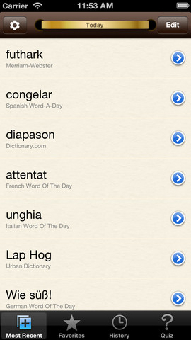 After being in a digital queue for over a month my iPhone 5 finally arrived. One of my favorite Apps, one I highly suggest you get if you are on i-devices, is Vocabology. It gathers all the "Word of the day" words from from sites such as Merriam-Webster, Dictionary, Wordsmith, Yahoo Education, and complies them … Continue reading I need Apps!